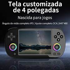 O texto descreve o console portátil Anbernic RG40XX H, projetado para jogos retro, com sistema operacional Linux e tela IPS de 4 polegadas (resolução 640x480). Compatível com mais de 5.000 jogos pré-instalados, ele suporta expansão de armazenamento até 512GB e possui bateria de 3200mAh. Inclui interfaces Type-C e HDMI, além de ser compatível com Bluetooth. Indicado para maiores de 5 anos, é feito de plástico, tem certificação CE e é de origem chinesa (CN). A embalagem está incluída.