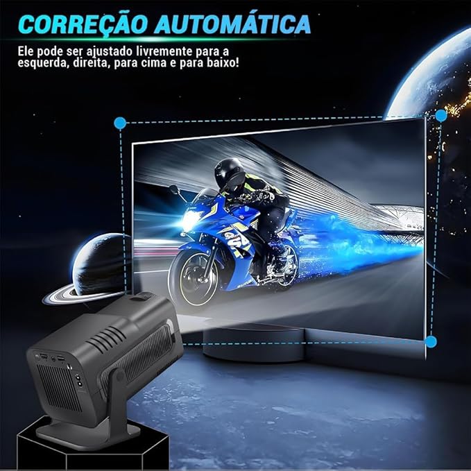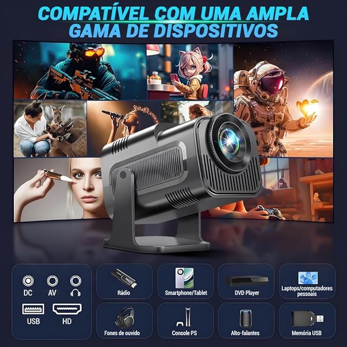 projetor Magcubic, um dispositivo portátil e digital com resolução Full HD (1920x1080dpi) e brilho de 390 ANSI lumens. Compatível com Android, ele projeta imagens de 40 a 150 polegadas, com distância de projeção de 1m a 4m e contraste de 10000:1. Equipado com tecnologia LCD, correção automática de imagem, alto-falante embutido e controle remoto, é ideal para home theater e jogos. Alimentado por fonte DC, inclui adaptador de entrada e é de origem chinesa (CN).